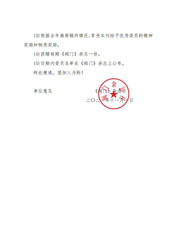 文章詳情接2021年11月1日《閥門》雜志社邀請函:鑒于黃山良業(yè)項美根先生具有端正公道、治學(xué)嚴(yán)謹(jǐn)?shù)牧己玫赖缕沸幸约霸陂y門業(yè)界享有的上佳美譽聲望和深厚學(xué)術(shù)造詣,特誠摯邀請項美根同志擔(dān)任本刊第六屆技術(shù)委員會成員。