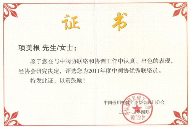 黃山良業閥門有限公司董事長是一位年長的全國閥門行業工作者,具有豐富的行業工作經驗,鑒于他在與中國通用機械工業協會閥門分會聯絡和協調工作中認真、出色的表現,被該協會評選為“2011年度中閥協優秀聯絡員”。